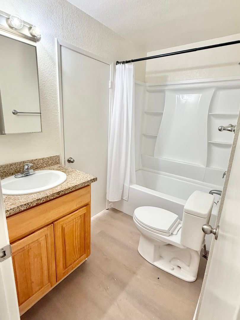 Spacious full bathroom with shower over tub, new vanity.