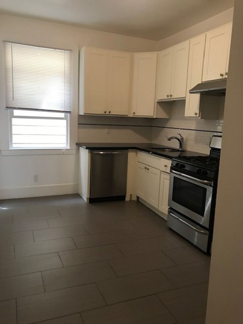 - Chef's kitchen with new tile flooring, quartz counters, stainless steel appliances.
