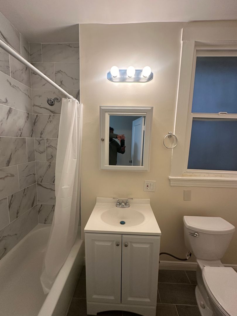 -Completely remodeled bathroom with a shower over the tub and a nice vanity.
