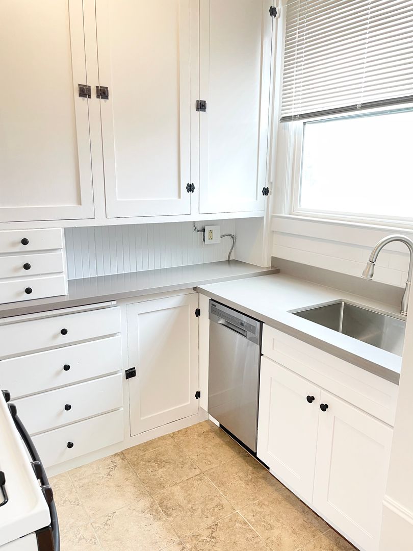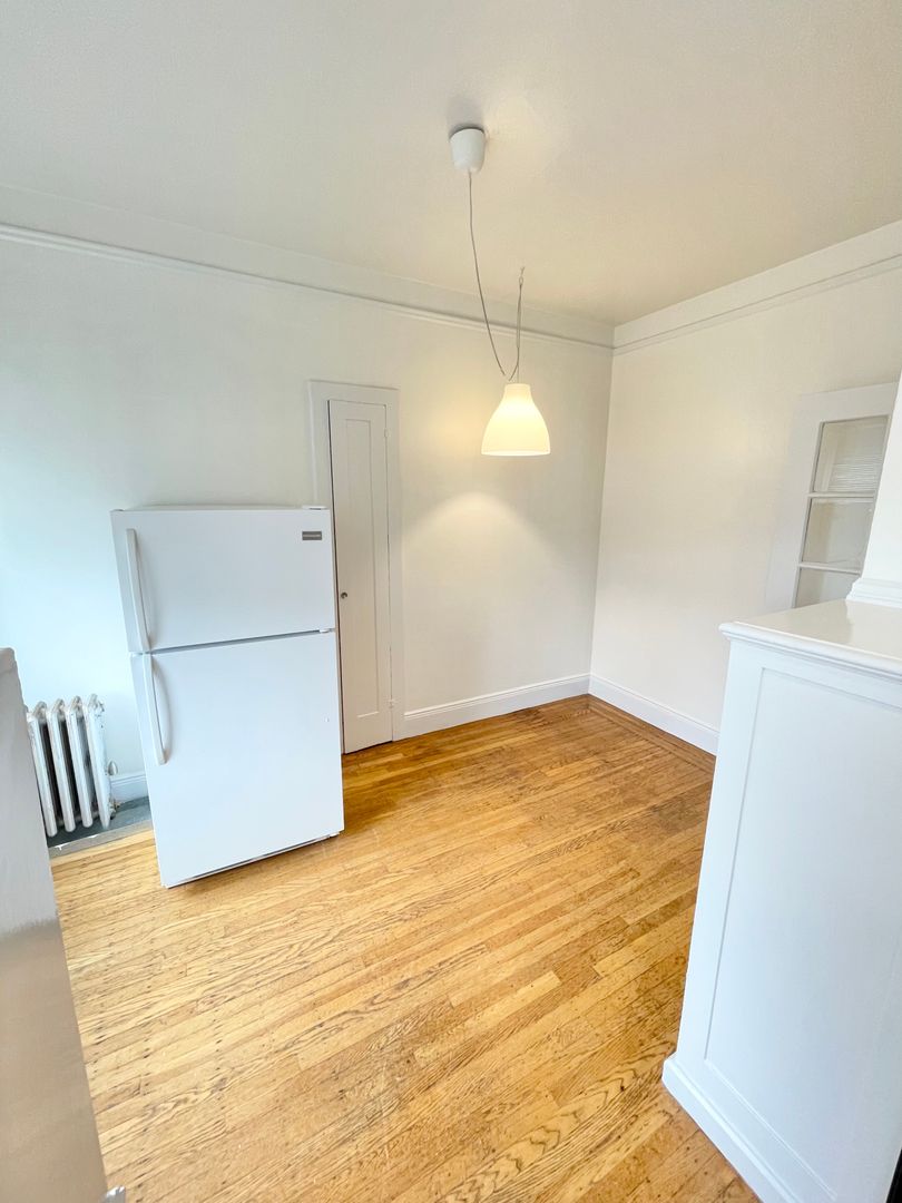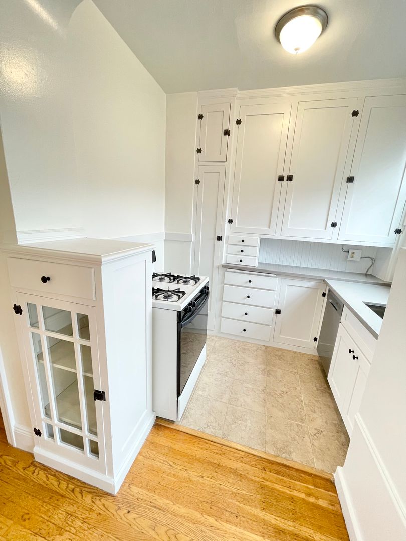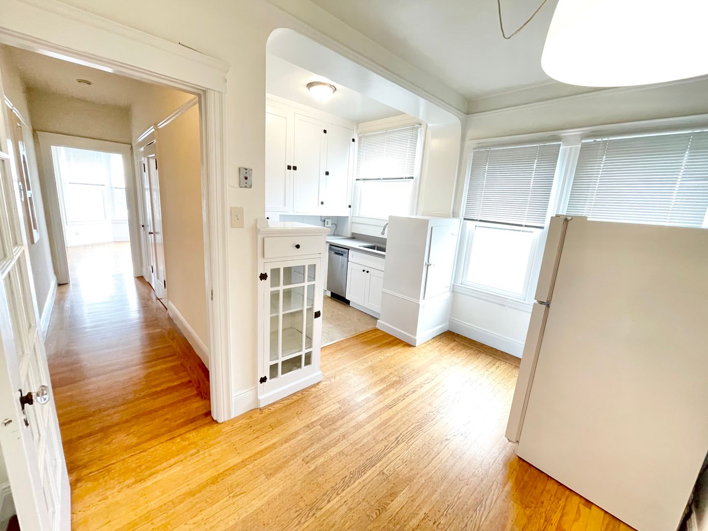 -Spacious eat in kitchen with large dining area and recently remodeled counter, gas stove, dishwasher, classic built-ins.