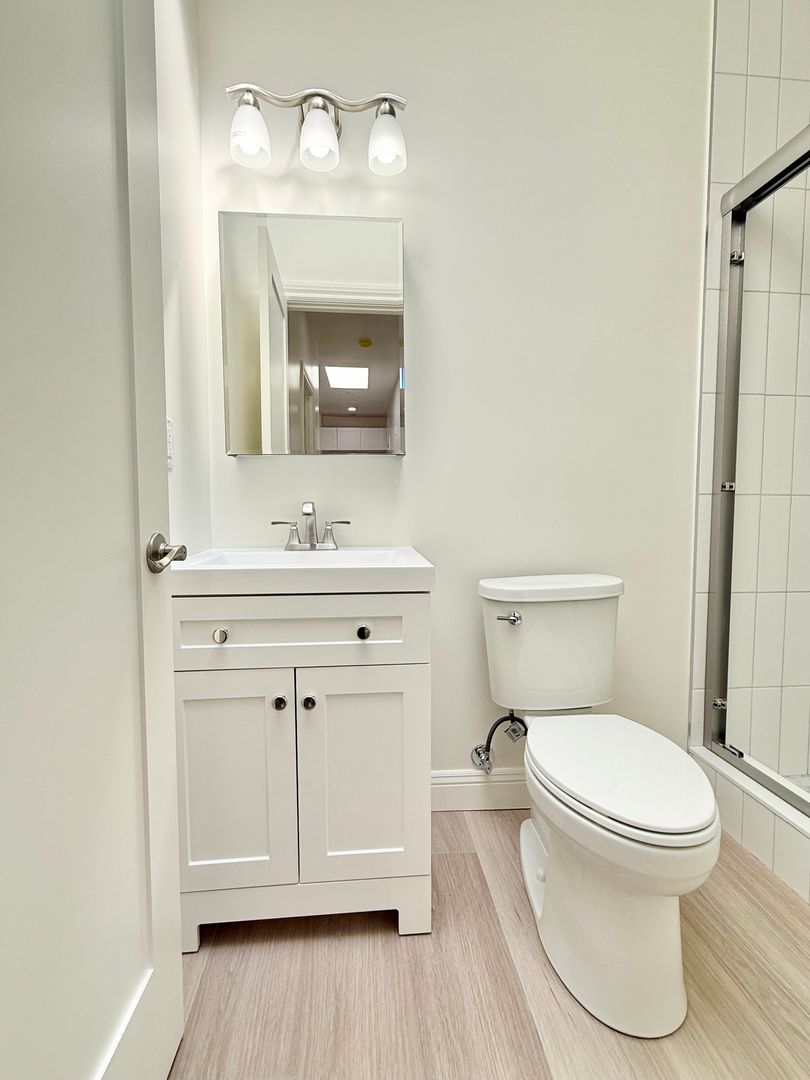 -1 completely remodeled bathroom with skylight, walk -in shower, vanity sink for extra storage.