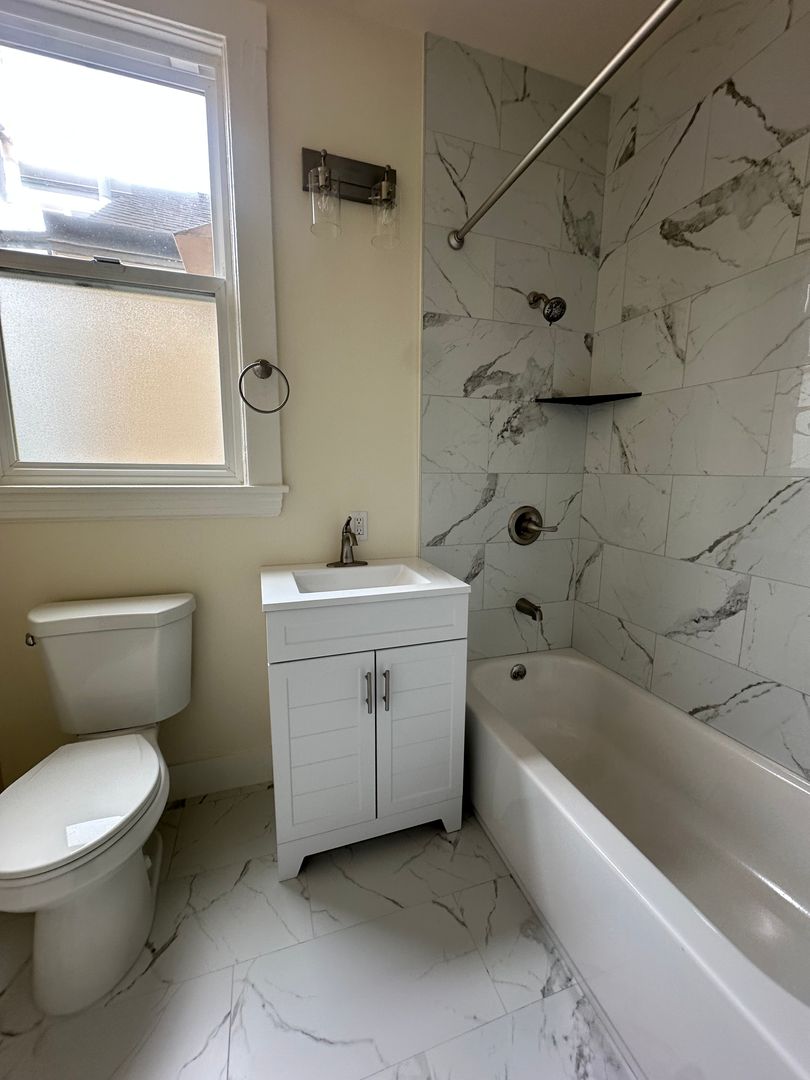 -Completely remodeled bathroom with a shower over the tub and a nice vanity.