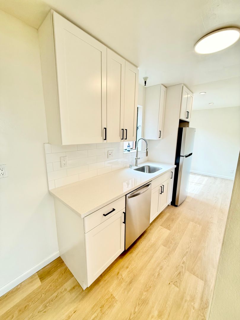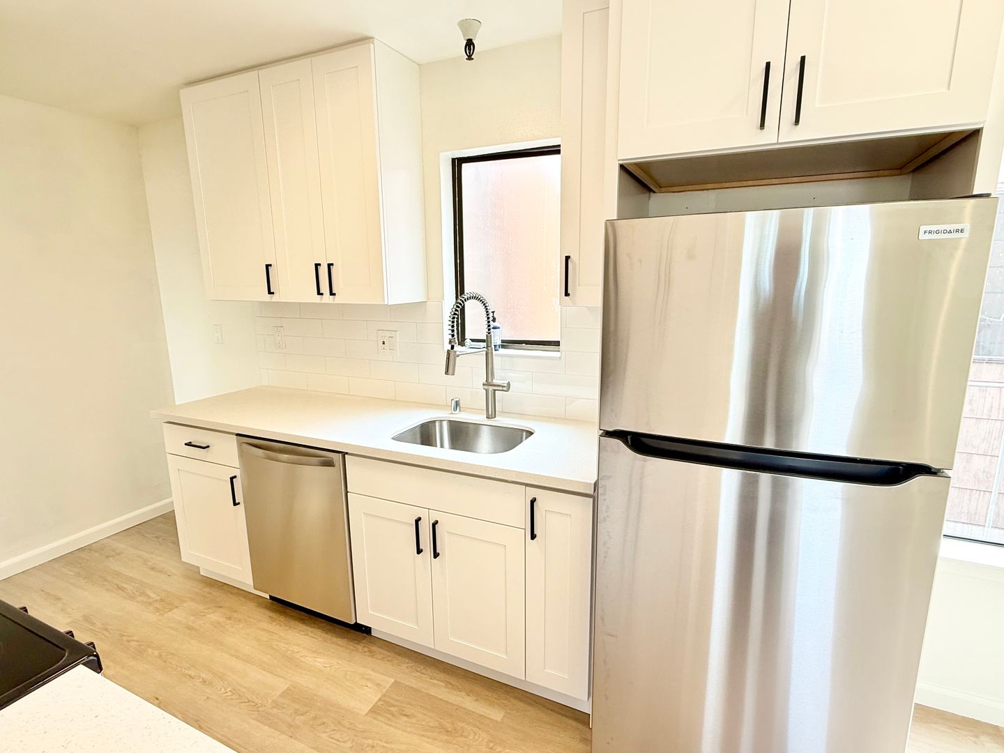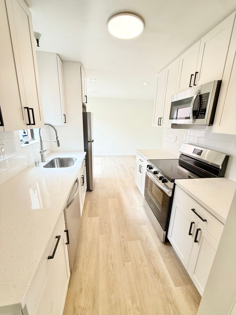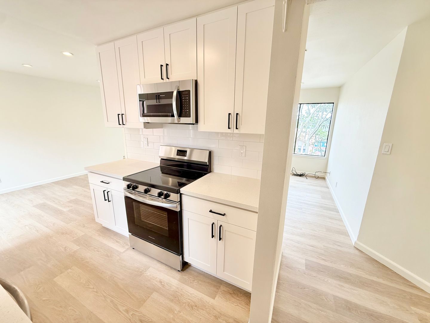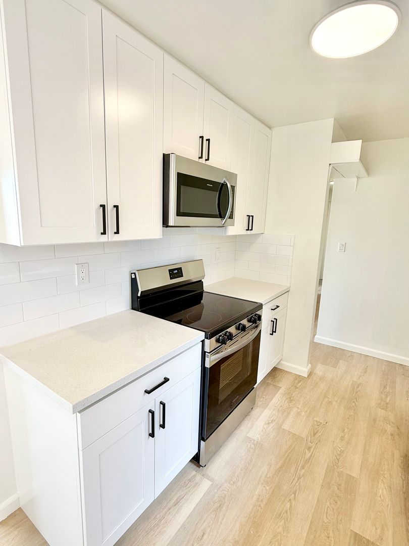 -Chef’s kitchen with quartz counters, white shaker cabinets, new stainless steel appliances.