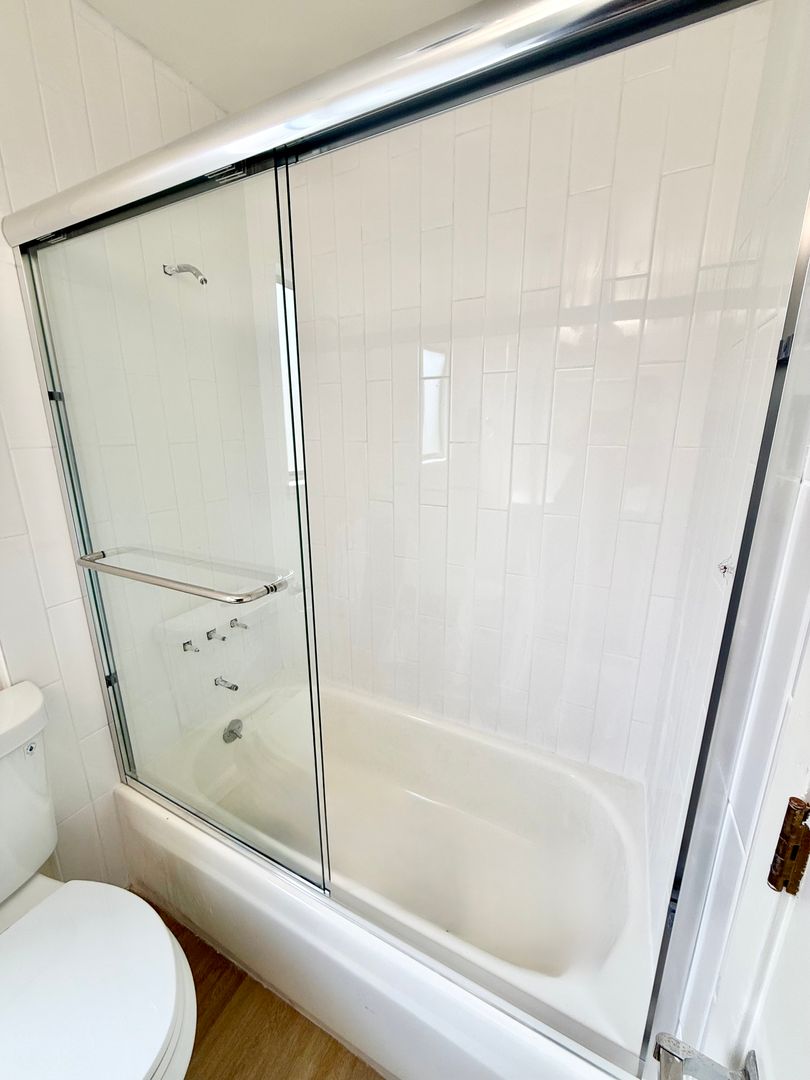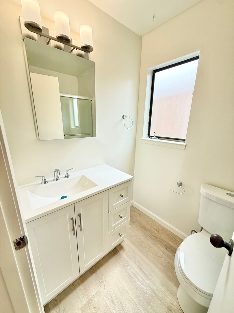 -Completely remodeled bathroom with shower over tub and large vanity.