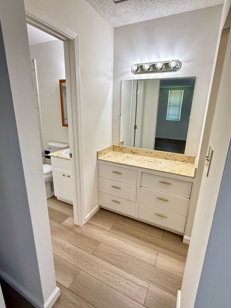 *Remodeled bathroom w/shower over tub, sliding showers doors, vanity & additional cabinetry for extra storage.