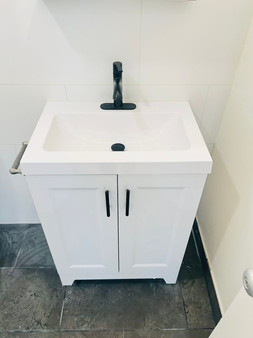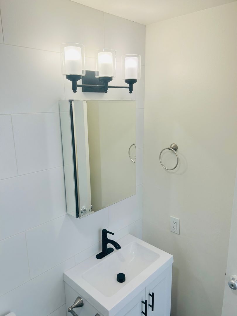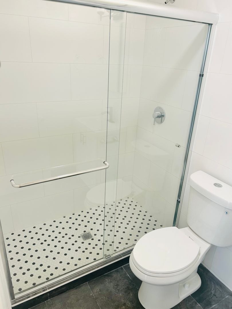 -Remodeled bathroom with large walk-in shower, new vanity, skylight, designer tile