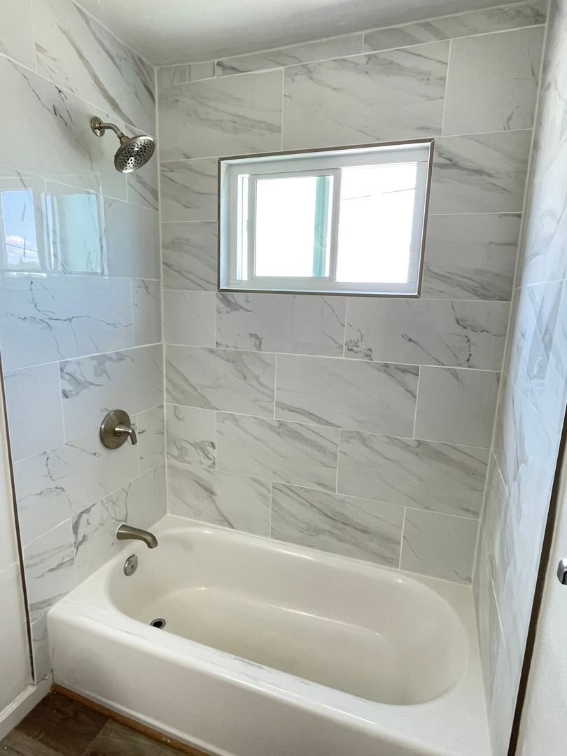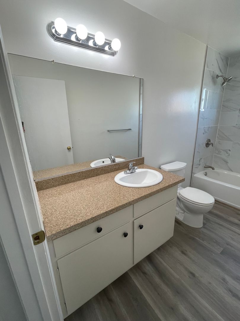 *Remodeled bathroom w/shower over tub, sliding showers doors, vanity for extra storage.