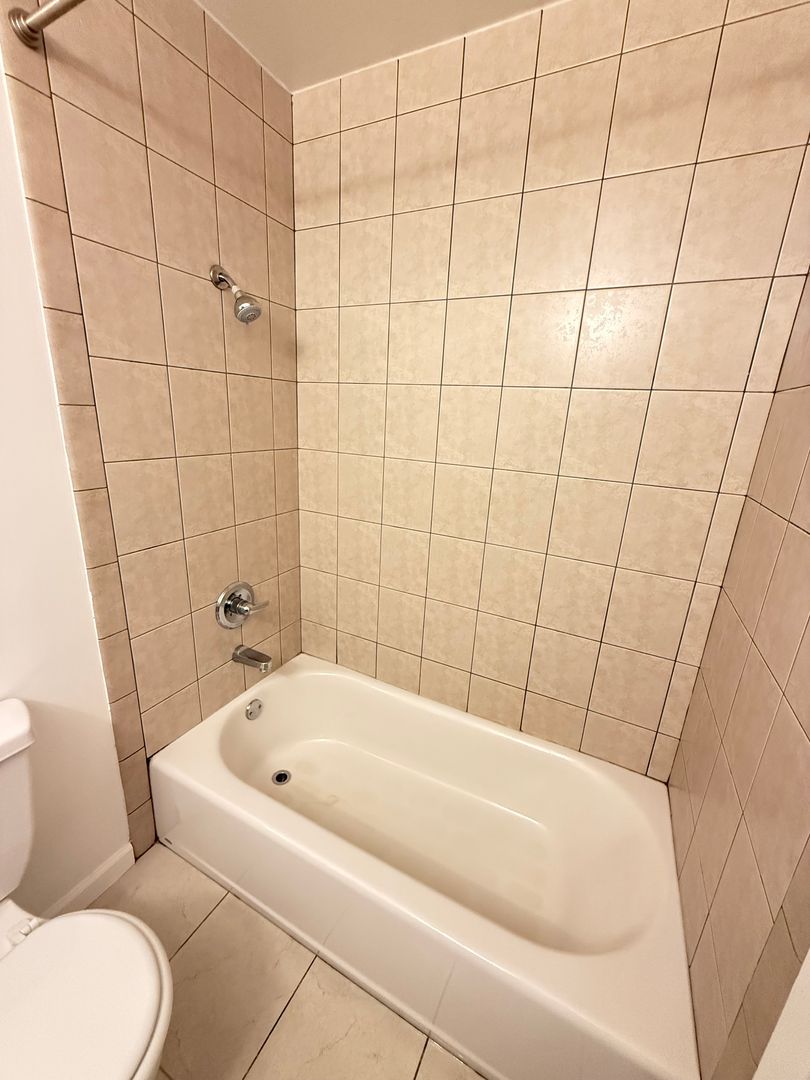 -Completely remodeled bathroom with shower over tub and large vanity.