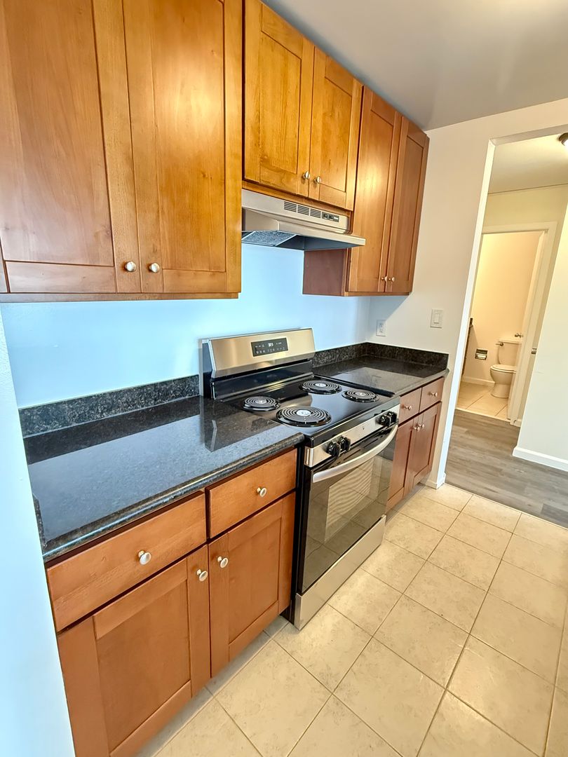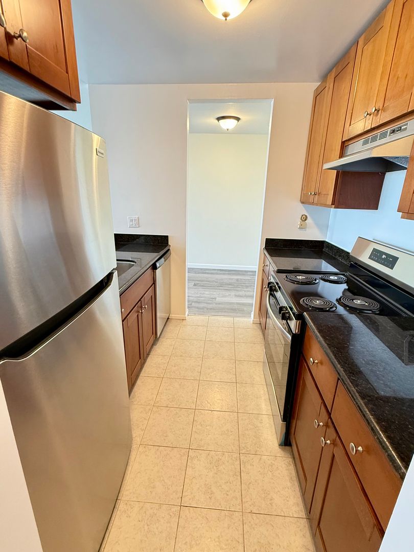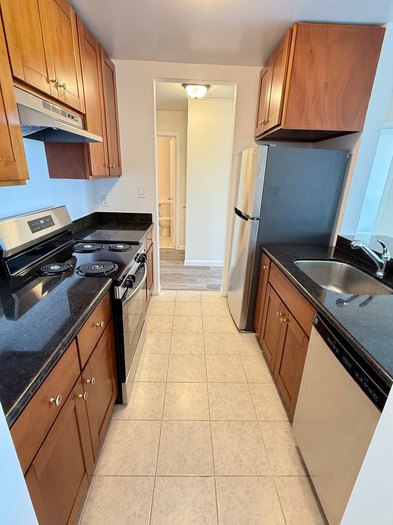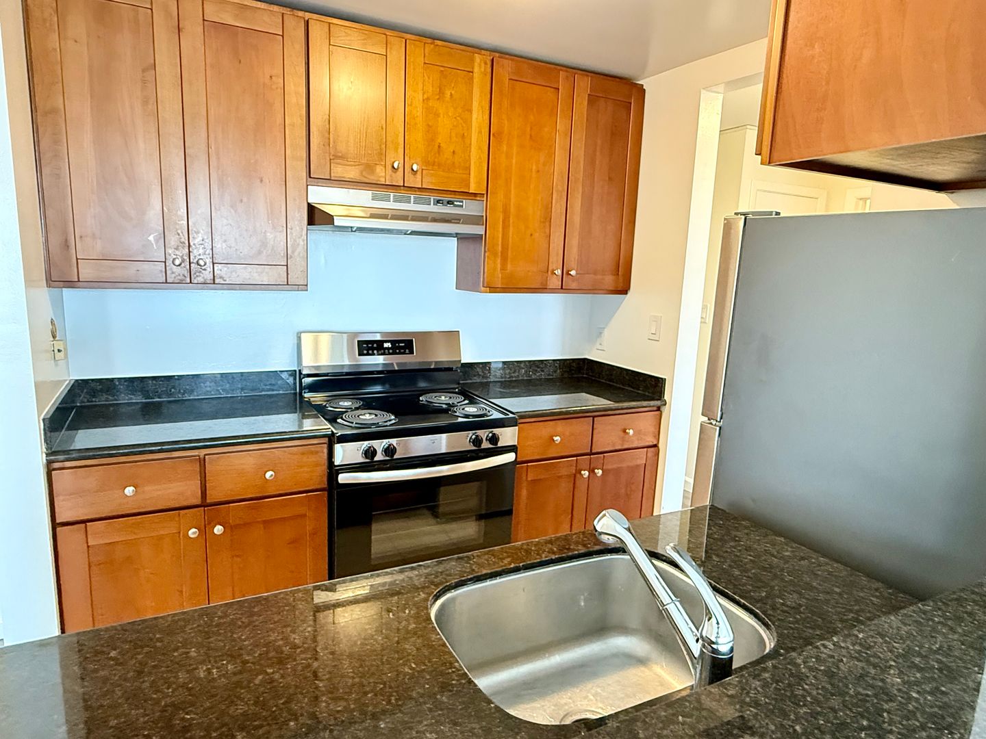 -Chef’s kitchen with granite counters, cherry shaker cabinets, new stainless steel appliances, island seating.